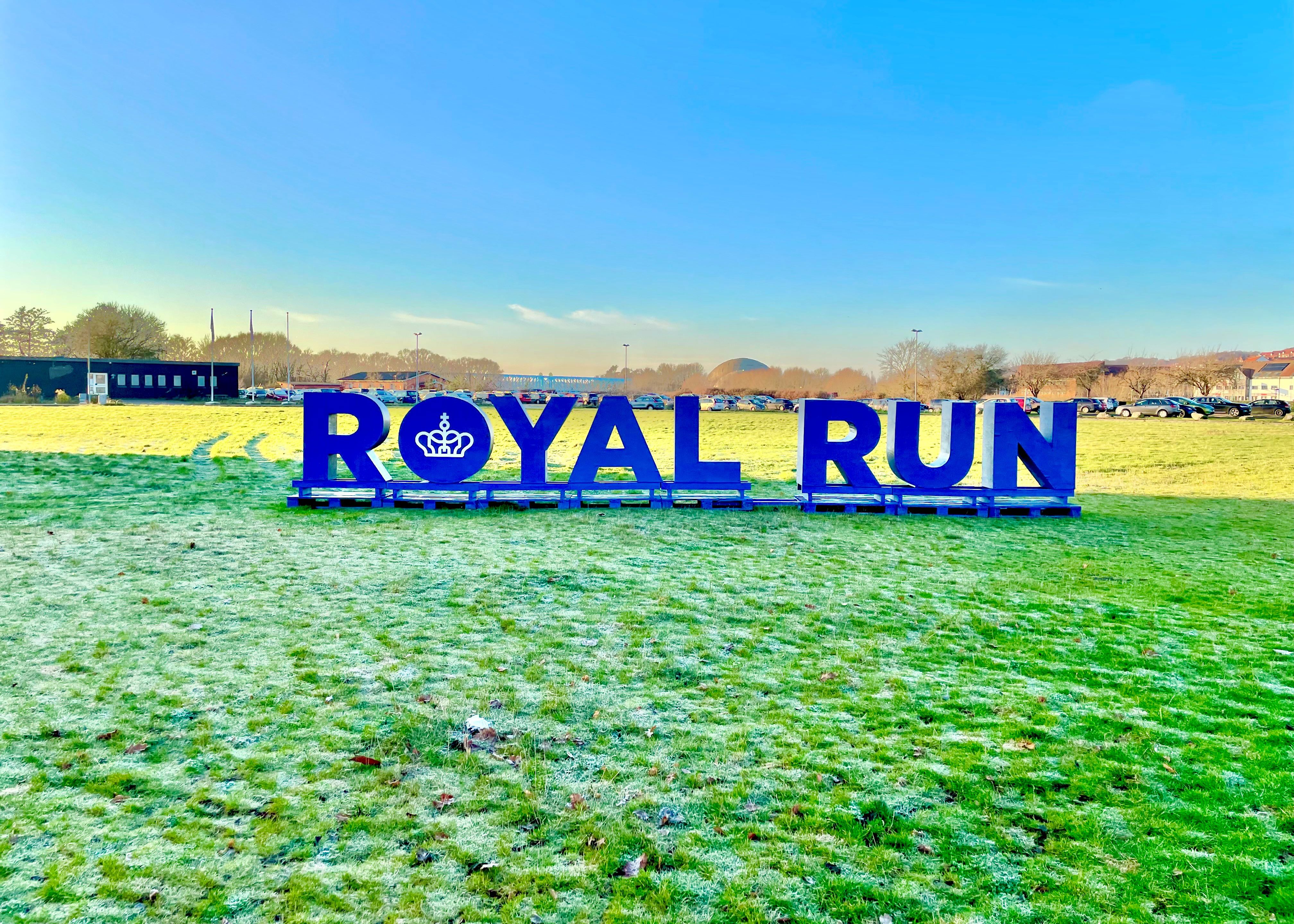 Store kongeblå Royal Run-bogstaver pryder plænen på Brotoften ved krydset Grenåvej/Aarhusvej. Fra torsdag eftermiddag, når mørket falder på, vil der også være lys i dem.